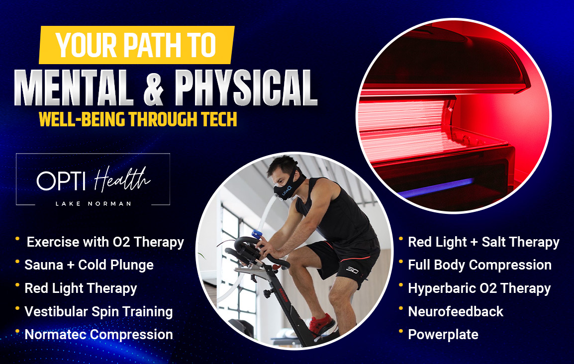 Our wellness modalities at OPTI Health Lake Norman include a variety of cutting-edge treatments designed to enhance overall health. These services include cold plunge and compression therapy for improved circulation and recovery, Intermittent Hyperoxic/Hypoxic Training (IHHT), and Hyperbaric Oxygen Therapy (HBOT) for increased oxygenation and healing. Additionally, we offer an infrared sauna, red light bed therapy, and the Vitality Booth to promote detoxification, cellular regeneration, and overall vitality.